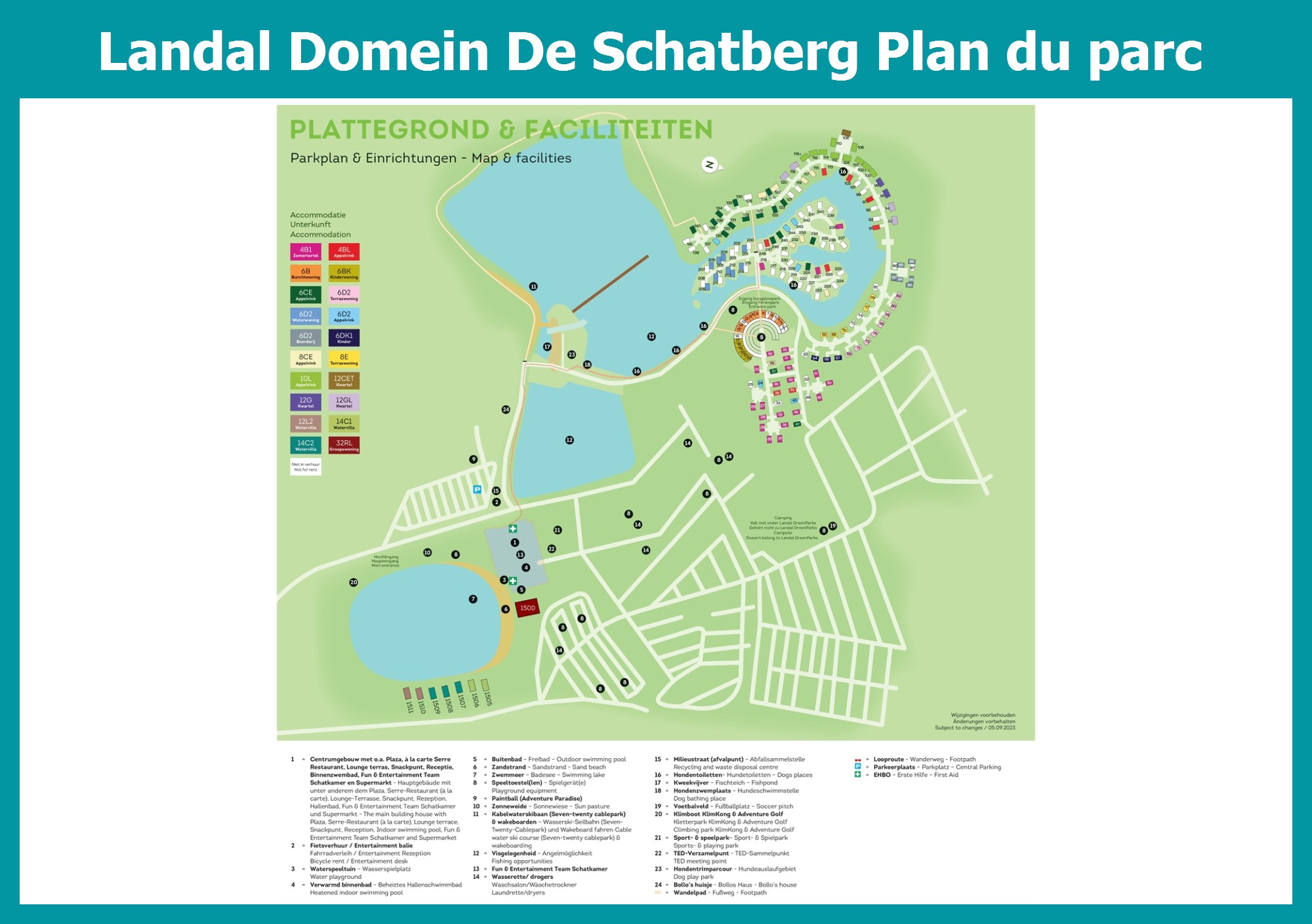 Le plan actuel du Landal Domein De Schatberg avec tous les hébergements et installations, est aussi disponible en pdf.