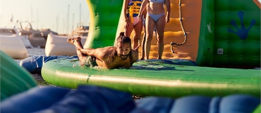Imaginez un paradis aquatique avec plus de 40 modules. Vous pouvez sauter, glisser et grimper dans ce nouveau paradis du jeu extérieur. Du fun en plein air et dans l'eau. Le tout dans un endroit sécurisé par une équipe de professionnels. Tous reçoivent un gilet de sauvetage.