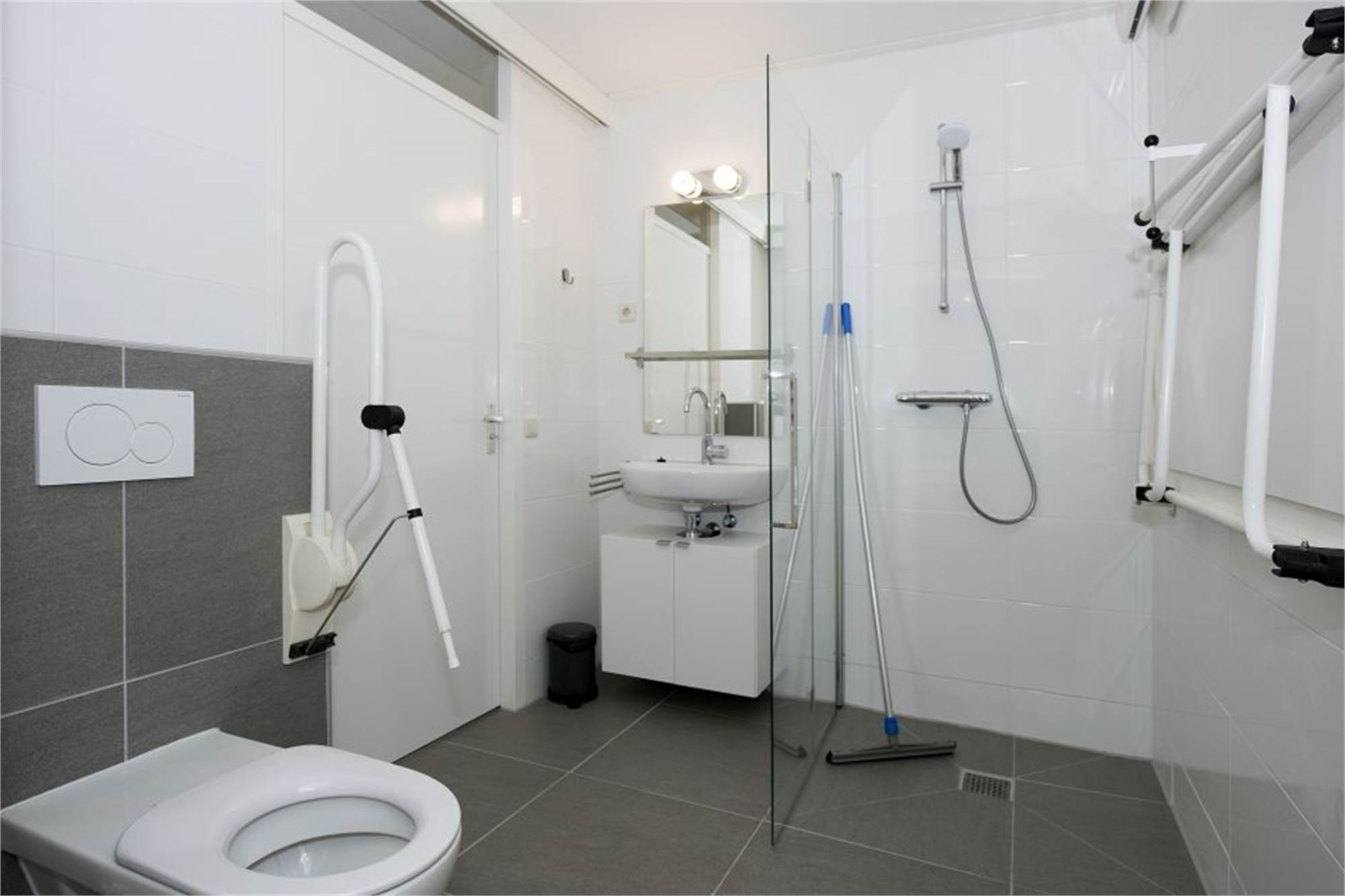 Super pratique : Ce bungalow est adapté aux personnes à mobilité réduite et dispose des équipements suivants : portes d'un minimum de 90 cm, un seuil de porte réduit à l'entrée et pour la terrasse, un rez-de-chaussée sans seuils et entièrement accessible en fauteuil roulant, une salle de bain au rez-de-chaussée également équipée d'un lève-personne et de barres d'appui pour les toilettes, et d'une chaise de douche amovible.